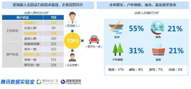 在出游人群中,職場(chǎng)新人出游動(dòng)力和需求最強(qiáng);而該人群對(duì)于水體娛樂(lè)、戶外探險(xiǎn)、海島和溫泉等自然風(fēng)光的好感度較高。