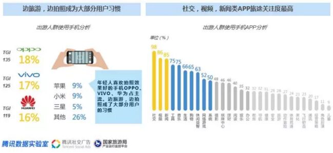 旅行中如何擁有完美的紀(jì)念照片已經(jīng)成為旅游用戶的一堂必修課,因此手機(jī)拍照能力是年輕人選擇手機(jī)的重要參考標(biāo)準(zhǔn)。此外,出游人群在旅途中對(duì)于社交,視頻,新聞?lì)怉PP的關(guān)注度最高。