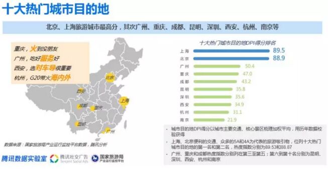 十大熱門城市目的地的第一名與第二名分別是上海和北京,便利的交通設(shè)施和眾多以5A和4A為代表的旅游吸引物成為其排名靠前的主要因素。