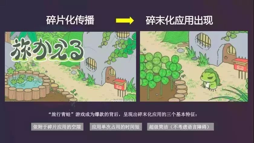 再看這個例子:今年比較火的一個社交游戲——旅行青蛙。2018年初,仿佛一夜之間,朋友們都養(yǎng)青蛙了,都開始有了一個牽掛的“蛙兒子”,養(yǎng)蛙兒子每一次只需要占用你半分鐘的時間,這是典型的從碎片化到碎末化的應用。