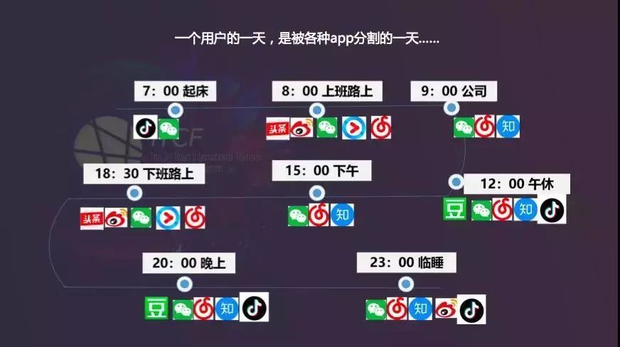 這張圖顯示的是,一個用戶一天的時間是如何被各種app分割的。小屏幕+移動場景+社交
