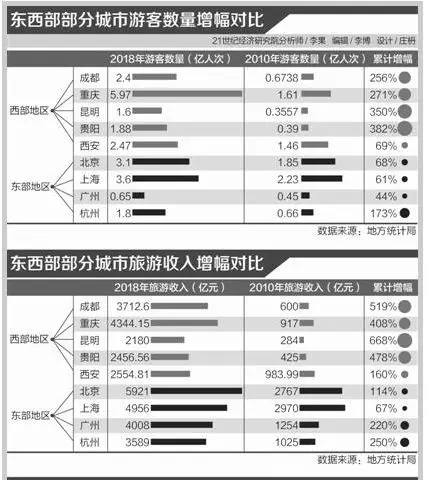 東西部部分城市游客數(shù)量與旅游收入增幅對(duì)比(來源:21世紀(jì)經(jīng)濟(jì)研究院)